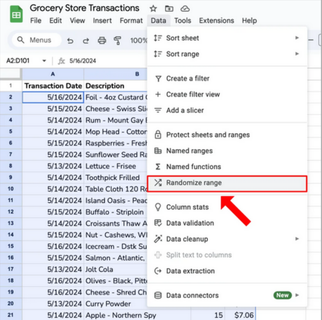 Next, You are going to want to shuffle the rows in your dataset. To do this, click on the “Data” tab and then select the “Randomize range” option.