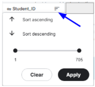 The red arrow points to a drop down menu that allows you to sort the data by ascending/descending order. You can also choose a minimum and maximum value that you want to see in the dataset as well.