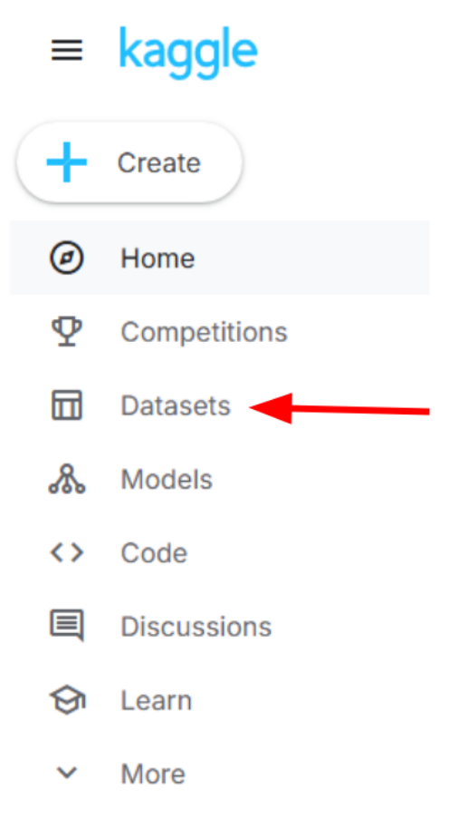 To begin this lab, use the link above to access the Kaggle website. Kaggle is a data science competition platform and online community for data scientists and machine learning practitioners, and it allows users to find and publish datasets. Once you are on the website, you’ll need to create a free Kaggle account. To create an account, look for the “Register” button located on the top right of the website and click it to begin registering. Once an account is registered, locate the datasets tab on the left side of the website.