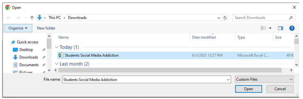 Then, you are going to find the “Open” option under “File”. This will open your computer’s “Downloads” folder for any downloads you have made on your computer. You will want to select the dataset file that you just downloaded to open for the spreadsheet you have just created.