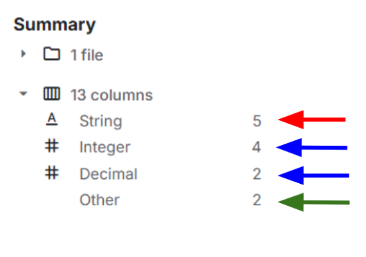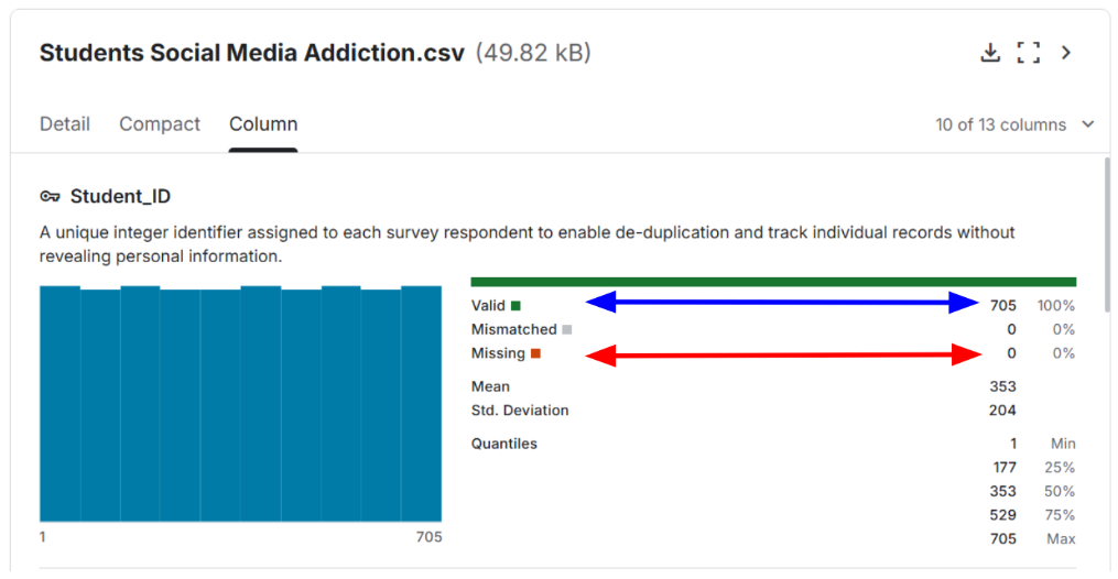 The “Column” tab provides an overview of each column in the dataset. This tab also notes if the column has valid data (blue arrow) or invalid, mismatched, or missing data (red arrow).