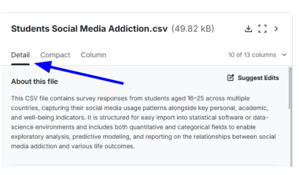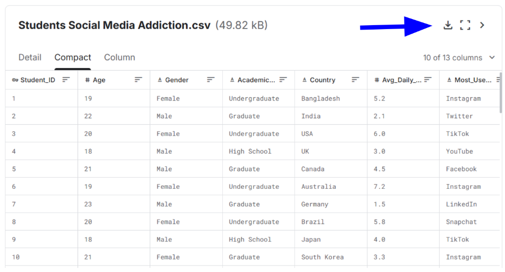 Once you have found an interesting dataset that satisfies the size criteria, you can download the dataset as a .csv file. To do this, click on the download button pointed out by the blue arrow on the “Compact” tab described in Part 2 of this lab.