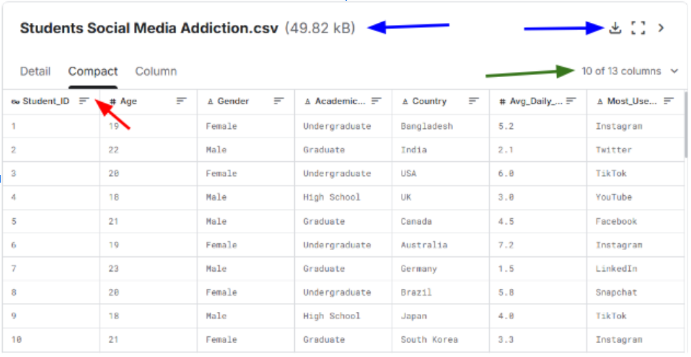 Review the Dataset Using the Compact and Column Tabs¶
