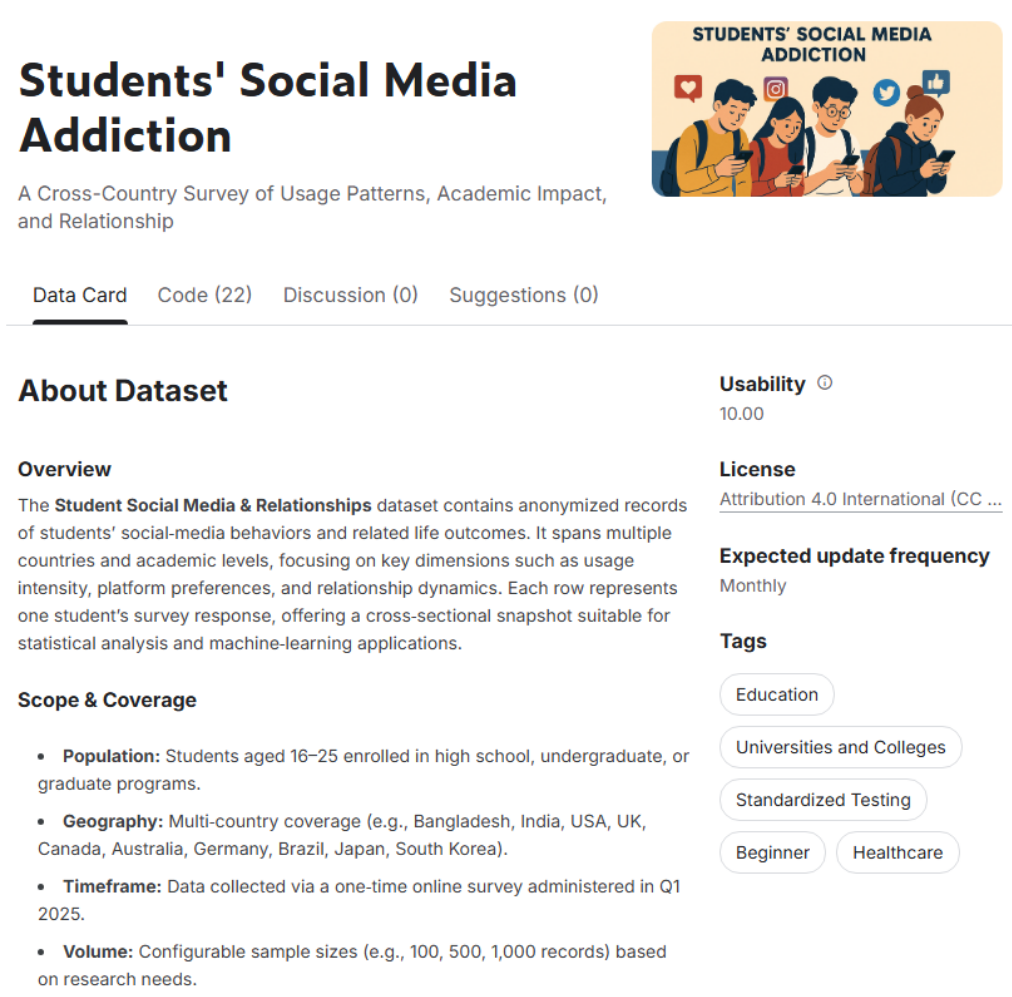 Most Kaggle datasets include a description explaining their purpose and contents. Once you have a dataset selected, you can start learning more about the dataset.