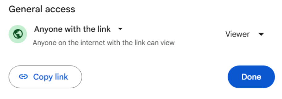 Once you click the share button, there will be a pop up window that has a section called “General access”. You will want to make sure that anyone with the link can be a viewer of your sample spreadsheet, so make sure the button on the right of the “Anyone with the link” section is set to “Viewer”.